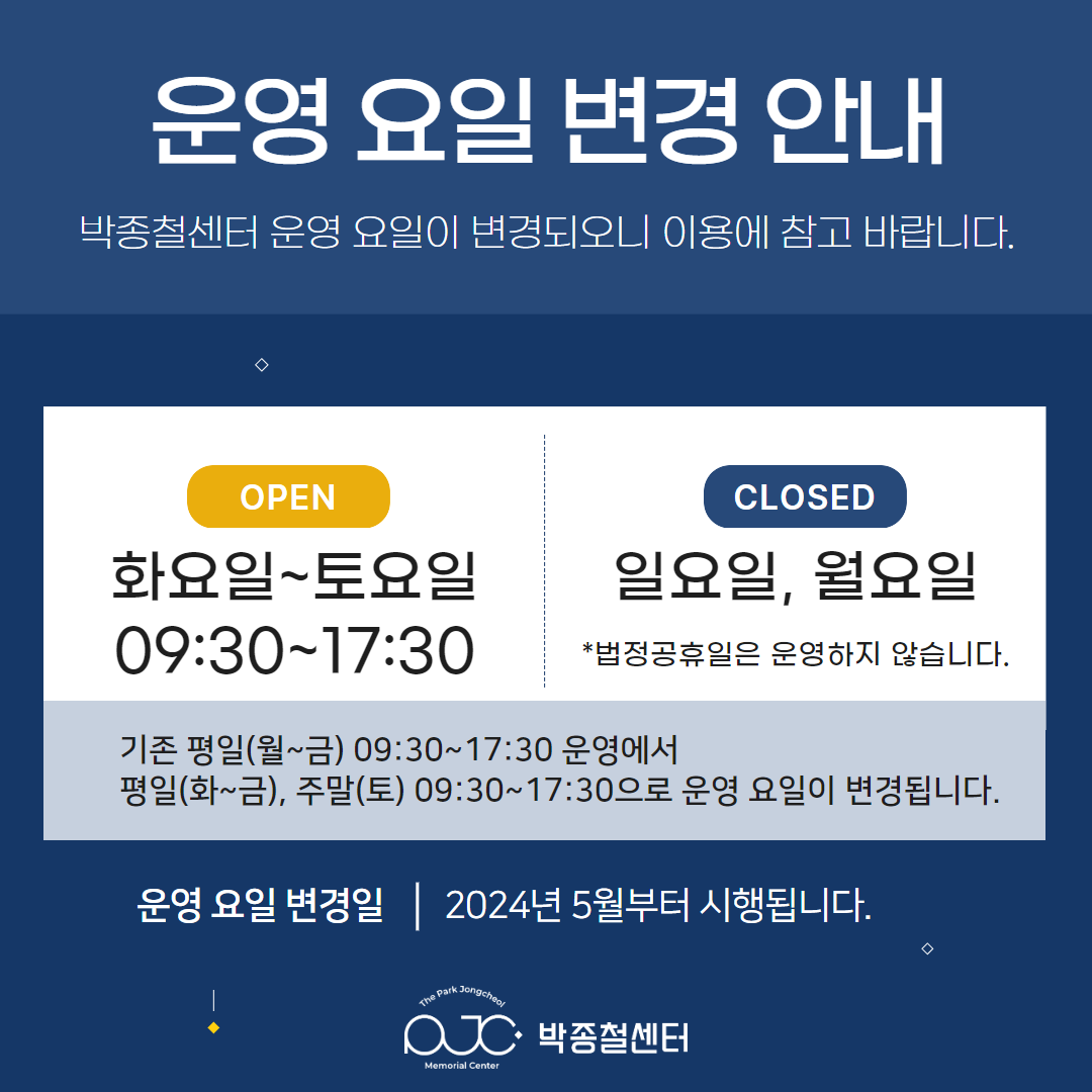 2024년 5월부터 박종철센터의 운영 요일이 변경되오니 이용에 참고바랍니다.