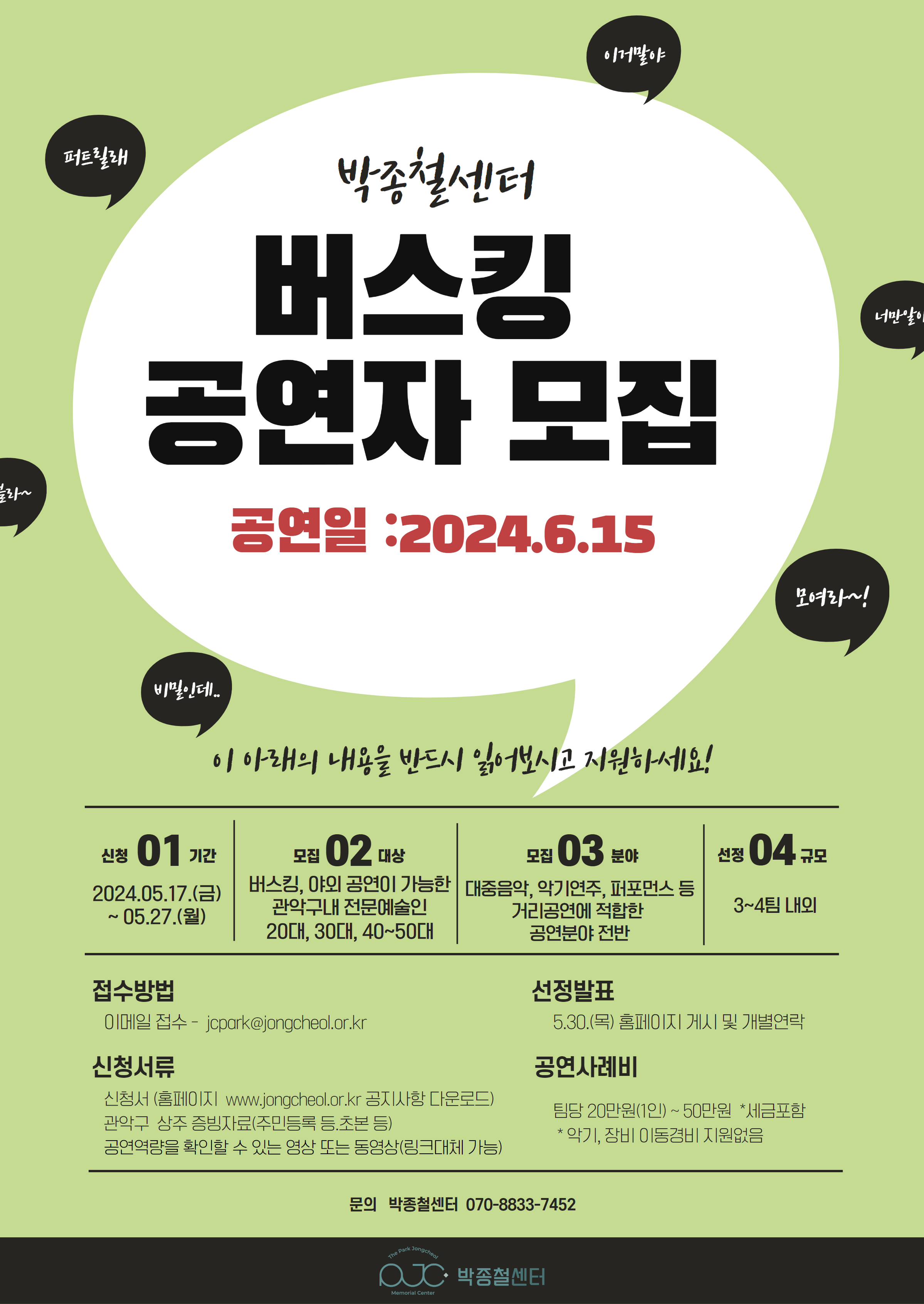 6.10민주항쟁을 기념하여 박종철센터에서 6월 15일 오후 1시부터 5시까지 축제를 엽니다. 축제에서 공연하실 관악구 지역 공연 예술인을 모집하고자 하오니