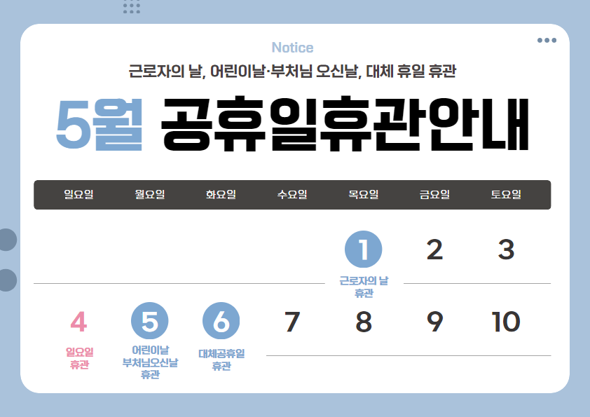 5월 1일 목요일(근로자의 날), 5월 4일 일요일, 5월 5일 월요일(어린이날·부처님 오신날), 5월 6일 화요일(대체 휴일) 휴관하오니