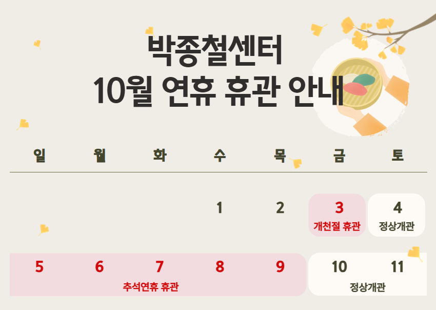 10월 3일 목요일(개천절), 10월 6일 일요일 ~ 10월 9일 수요일(추석 연휴) 휴관하오니 방문에 참고하시기 바랍니다.